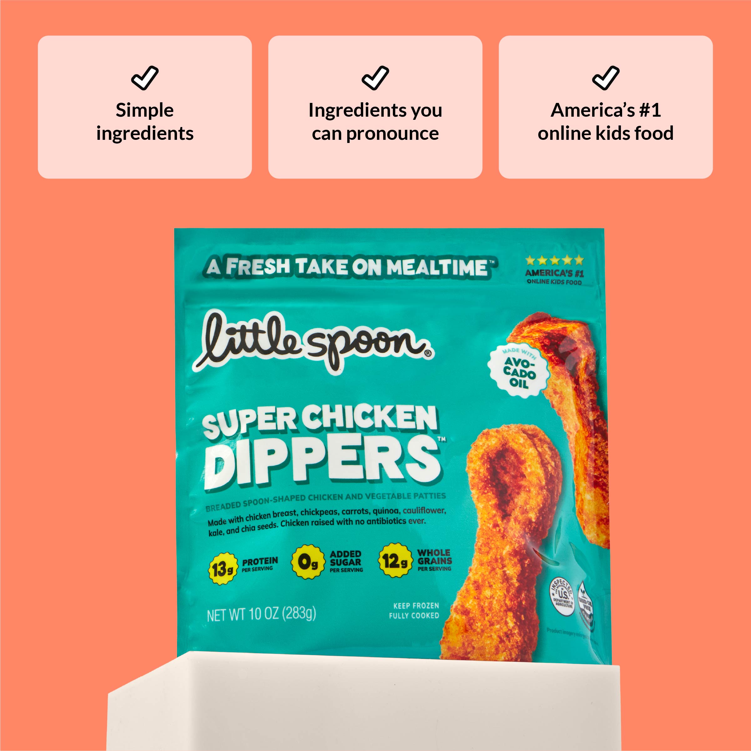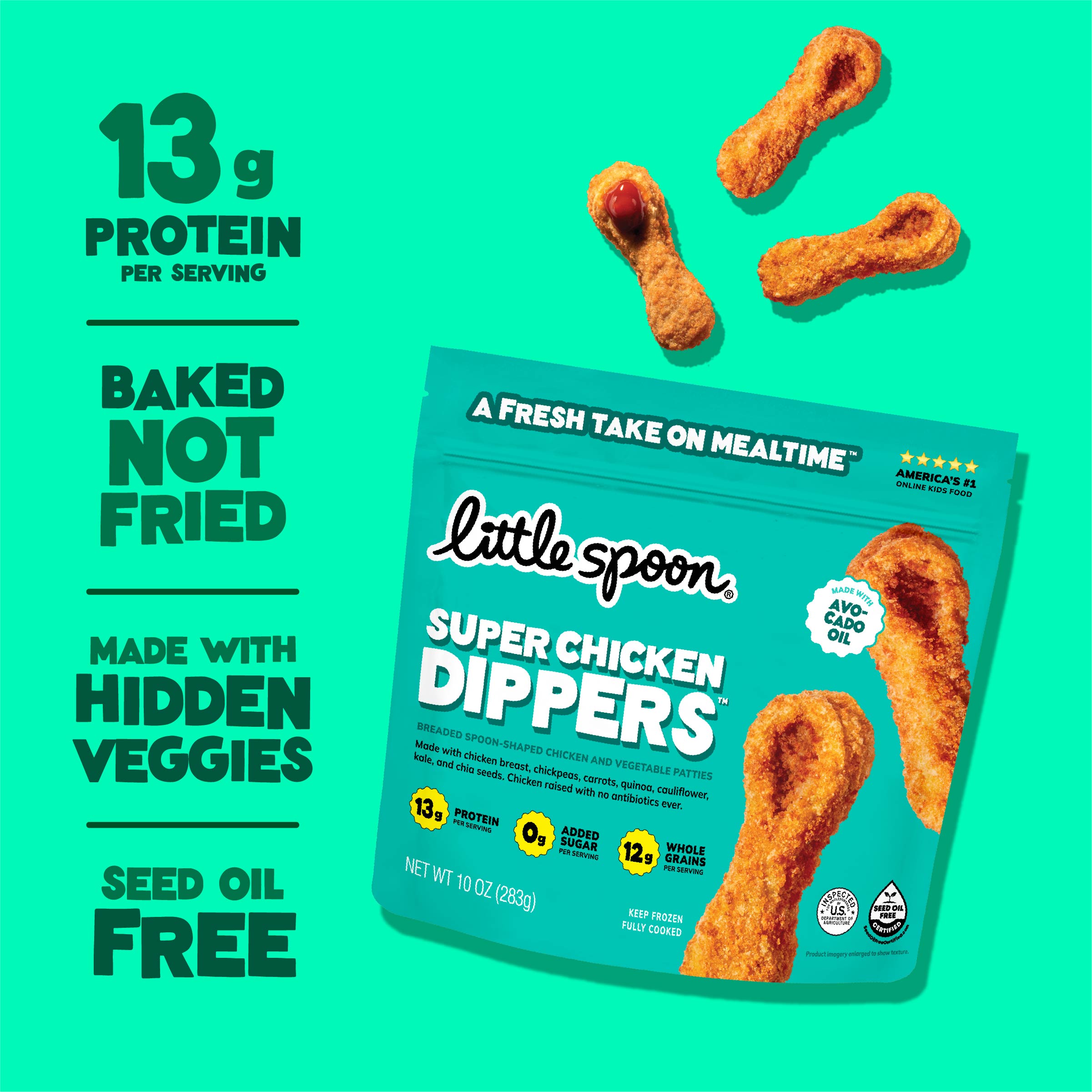 Super Chicken Dippers aren’t just nuggets—they’re the world’s only patented, antibiotic-free superfood nugget, made for dipping. Oven-baked in avocado oil (never seed oils) and packed with hidden veggies like chickpea, carrot, cauliflower, kale, quinoa and chia. They dip, they dunk, they win over picky eaters every time. Perfect for whatever sauce they can't live without this week.