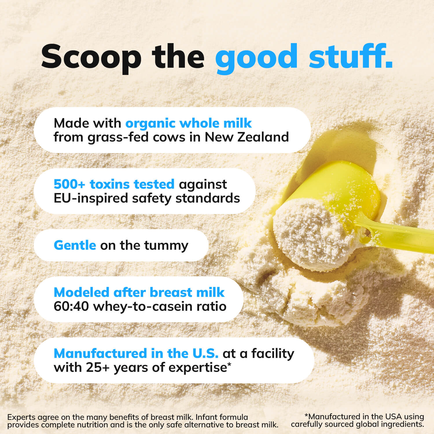 - Our formula recipe starts with organic, grass-fed whole milk from New Zealand cows raised with space to roam year round and graze in pastures free of synthetic pesticides. We chose a whole-milk base, so babies get more naturally occurring milk fats and fewer added oils—closer to the natural composition of breast milk. Every batch is tested for 500+ toxins, including heavy metals, and held to both US + European organic standards, plus our own strict EU-inspired safety limits. Learn more about our commitment to transparency and our publicly available testing limits.