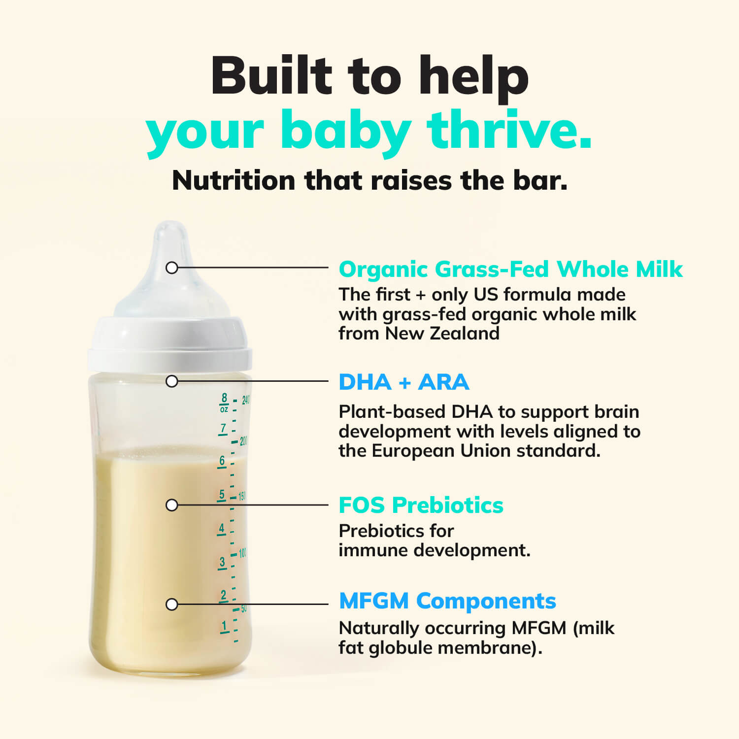 - Organic whole milk naturally contains beneficial milk fats—like milk fat globule membrane (MFGM) components, which is found in breast milk! A whole-milk base gives our formula a naturally mild taste and a fat profile closer to what babies are used to, so we can rely less on added oils while still delivering the nutrition babies need to grow strong through their first year of life.