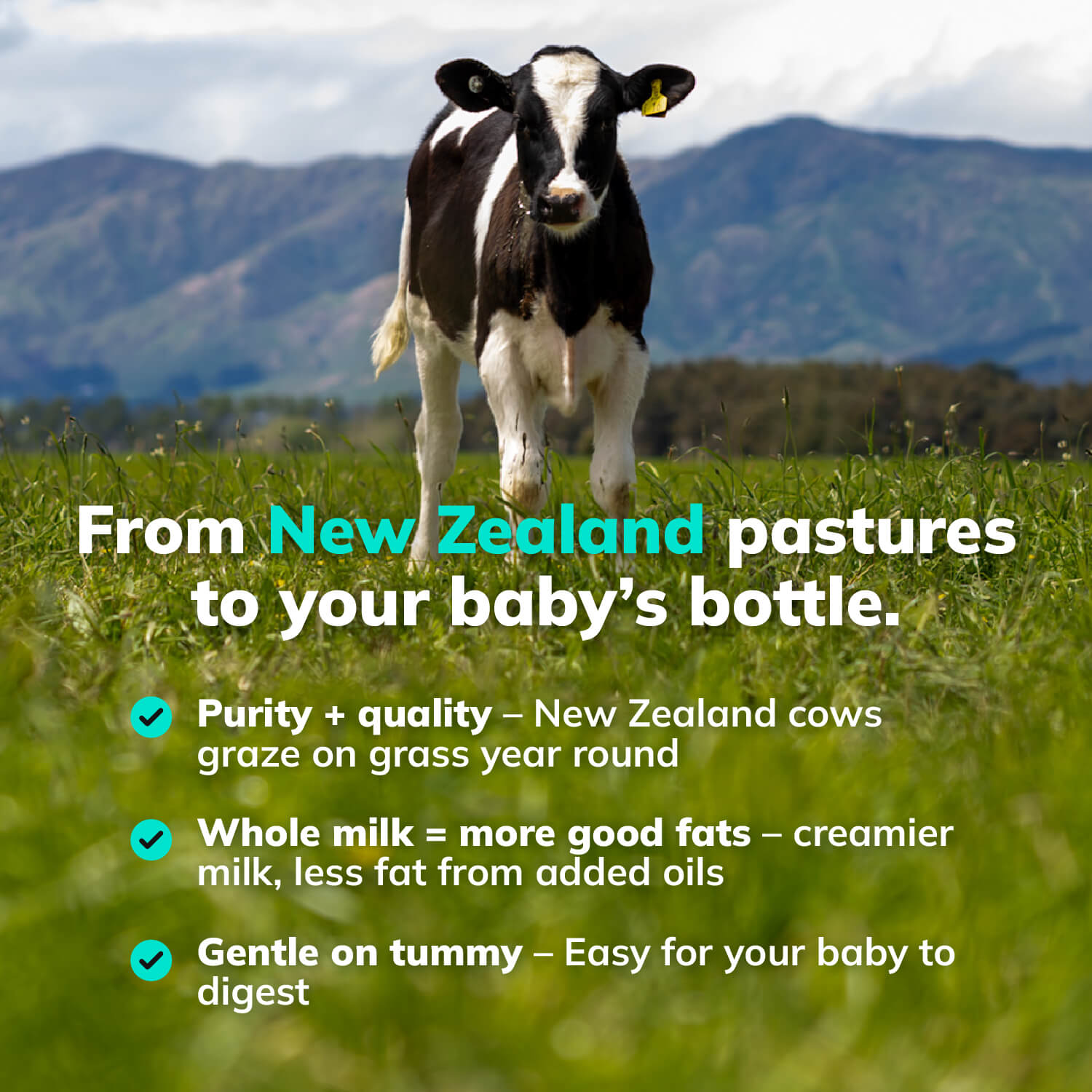 - We searched globally for the very best milk for your baby and found it in New Zealand, where high standards for dairy farming are the norm, not the exception. Our organic whole milk comes from grass-fed cows that graze freely on pasture. Synthetic pesticides and fertilizers are prohibited under organic rules, and the supply chain is closely monitored from farm to finished product. It’s simple: when cows are treated well and fed real grass, the result is exceptional milk. And because we know quality milk is the foundation of quality formula, New Zealand was the clear choice!