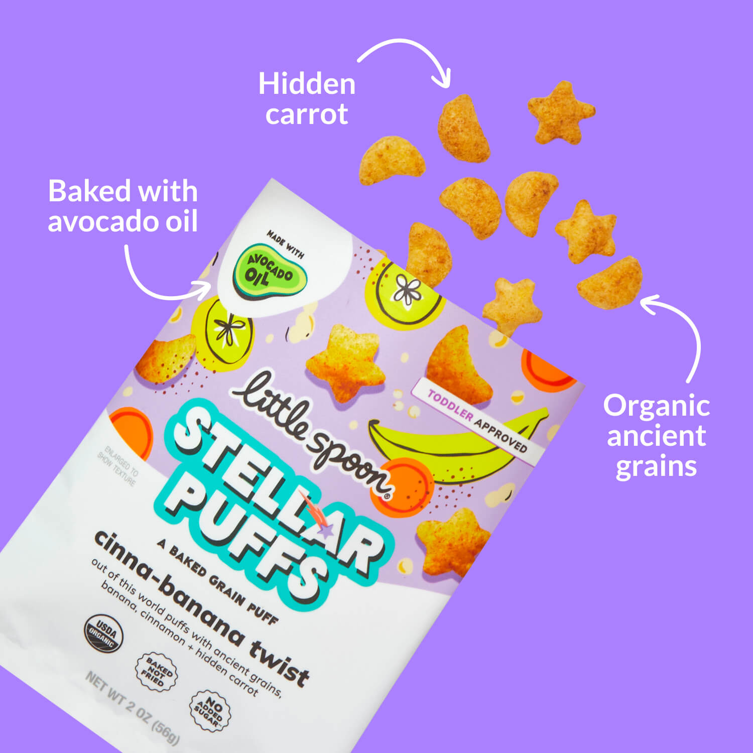 A sweet spin on space fuel. Made with real banana, cinnamon stardust and carrot, these organic puffs are a launchpad for galactic appetites—nothing artificial, just better ingredients for out-of-this-world snacking.