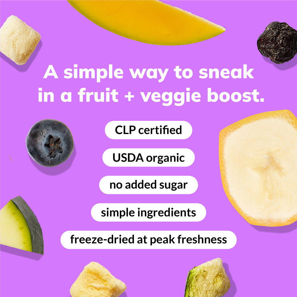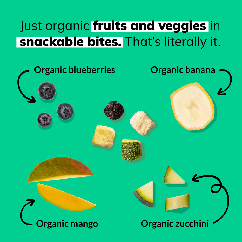 Made with real organic fruits and veggies. No added sugars, no junk, just whole foods, kept simple. Diced mango, zucchini, banana, and blueberries are gently freeze-dried into pincher-friendly bites that melt like magic. A fruit-and-veggie-packed win!