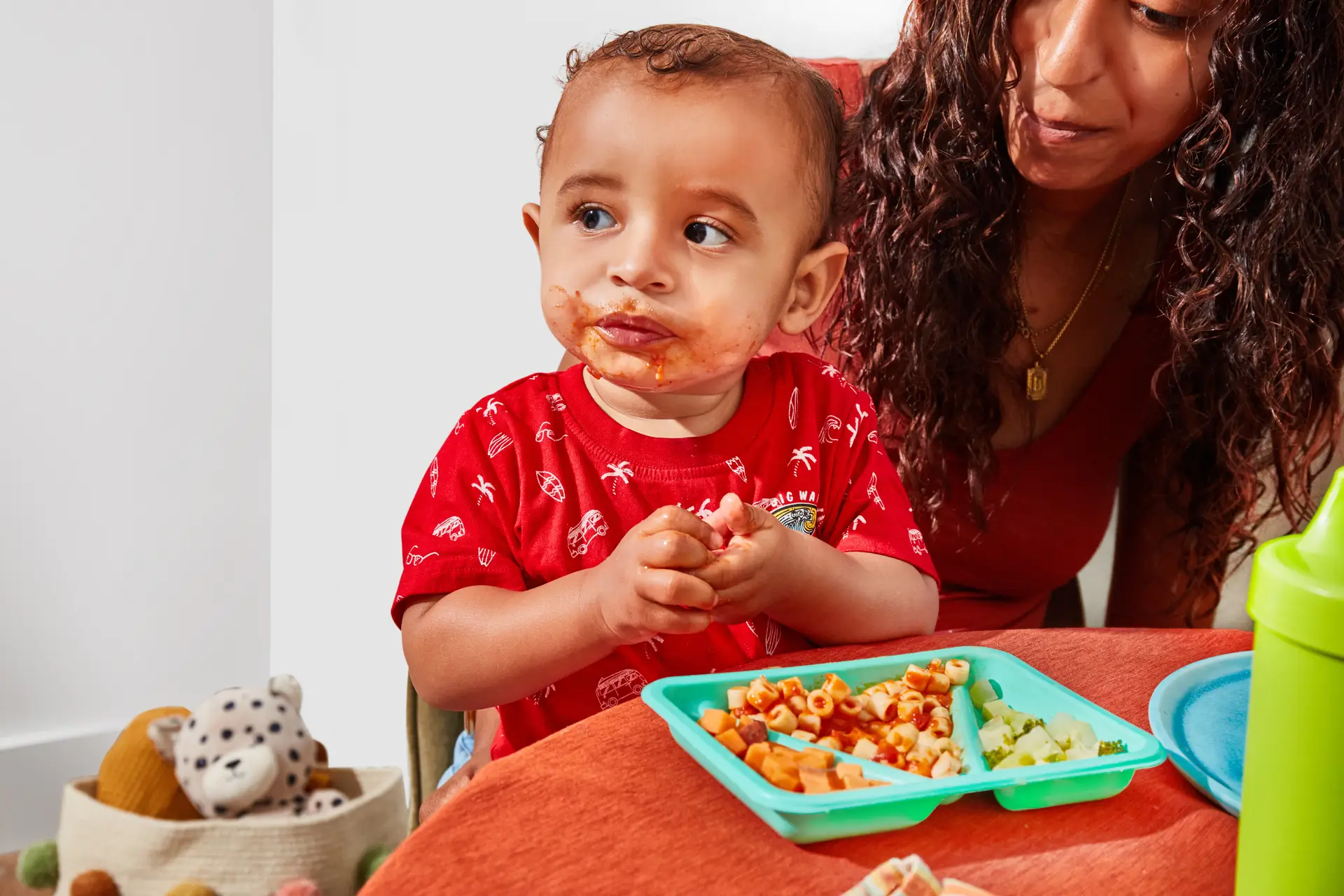 This is Bennett, exploring his Little Spoon prunes through his tactile, visual, and gustatory system (touch, sight, and smell). Messy play is beneficial when introducing purees, soft solids, or any table foods.